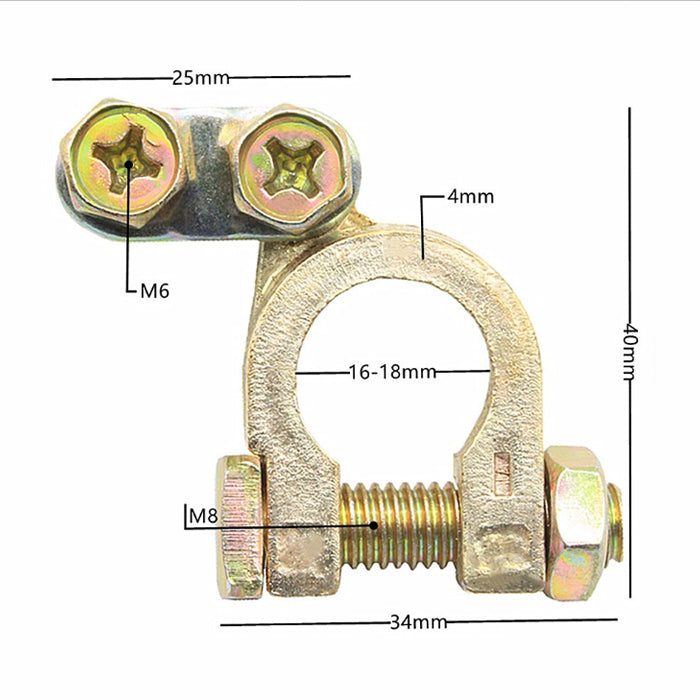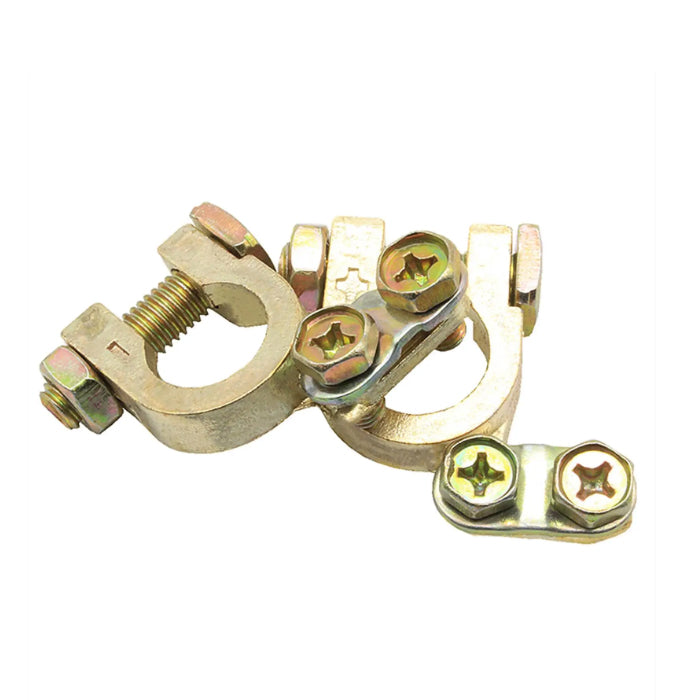 Здрави и надеждни клеми за акумулатор, предназначени за сигурно свързване на кабелите към акумулаторните изводи. Изработени от висококачествен материал с добра проводимост и устойчивост на корозия. Подходящи за автомобили, камиони и други превозни средства.