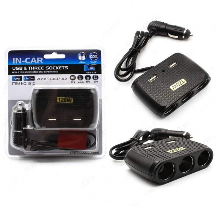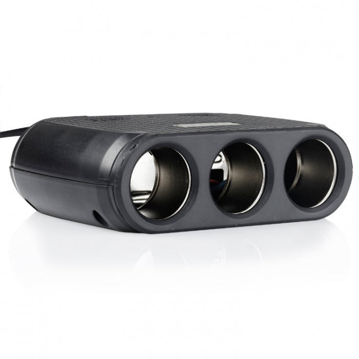 Разклонител с 3 гнезда за запалка и 2 USB порта разположени в горната част.