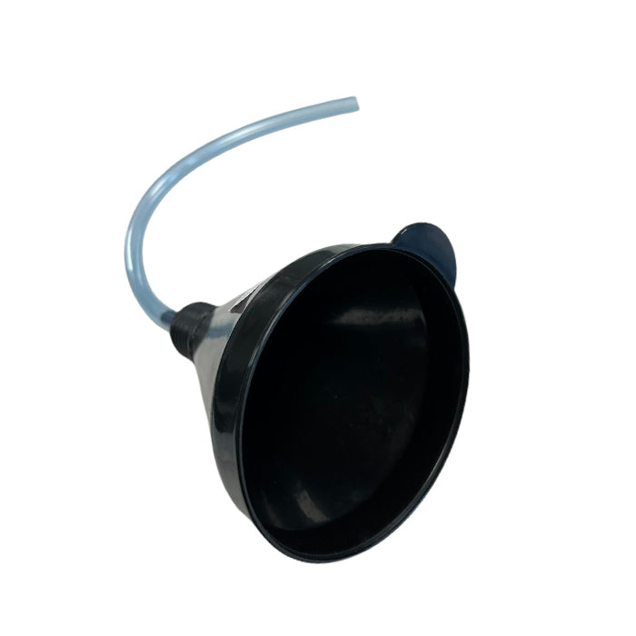 Практична фуния, предназначена за наливане на гориво и други течности. Оборудвана с гъвкав маркуч с дължина 40 см за удобство при трудно достъпни резервоари и вградена цедка за задържане на замърсявания. Изработена от устойчиви материали, подходяща за автомобили, мотоциклети, градинска техника и др.